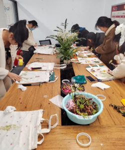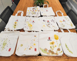 在葉拓實(shí)踐上,一片片鮮活、形態(tài)各異的葉片經(jīng)清洗后置于桌上。我們小心翼翼地將各種樹葉各種花瓣放置于明礬水中固色,幾分鐘后取出樹葉或者花朵將他們置于布袋上面,再用膠帶固定植物,用工具錘敲打植物以致于植物的顏色與布袋融合,最后取下膠帶,一幅幅美麗的圖像就拓印在布袋上,脈絡(luò)清晰可見。同事們?cè)谌~拓中充分發(fā)揮自己的想象力和創(chuàng)造力,制作出美麗的葉拓作品。